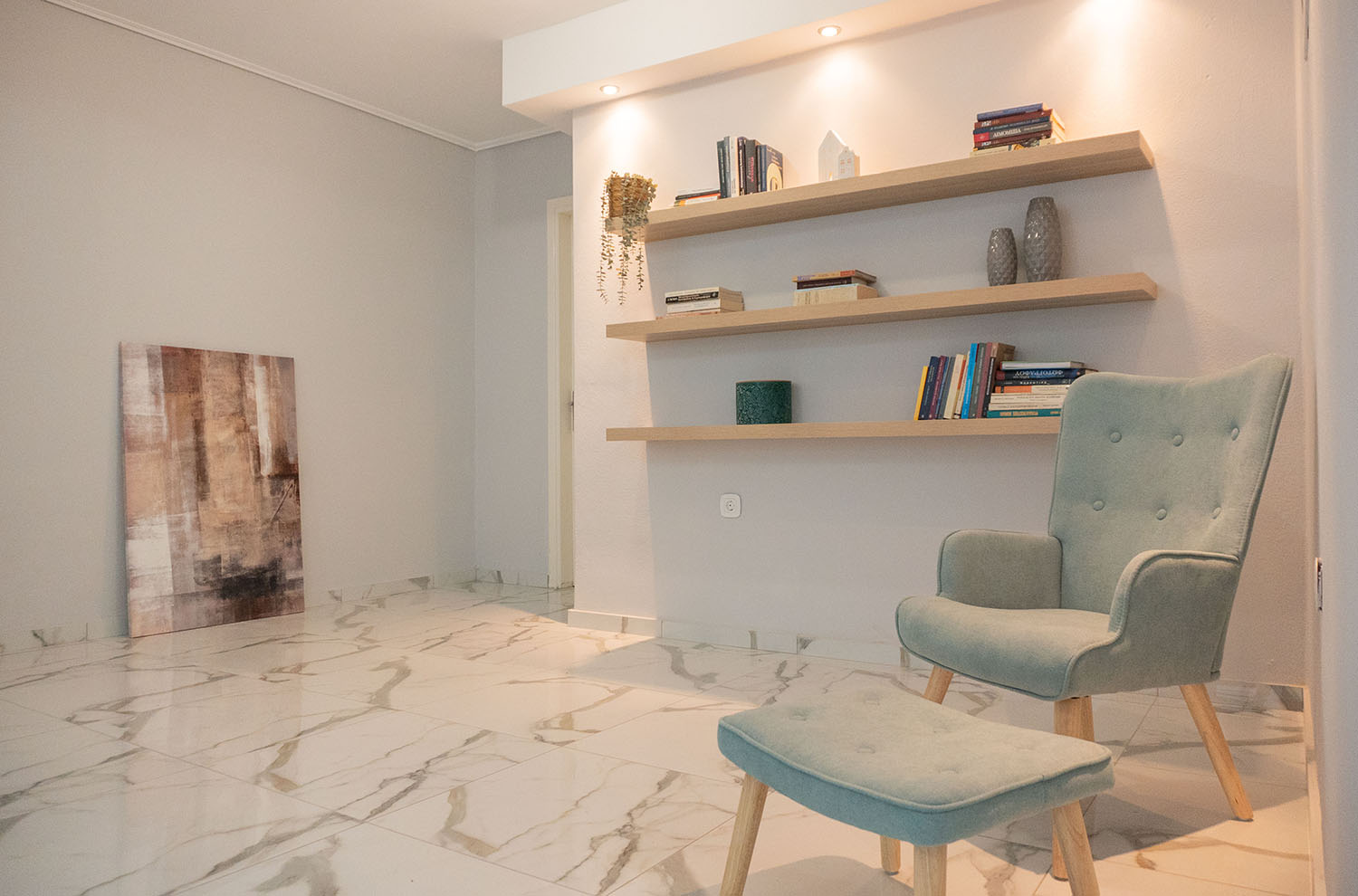 Με ζεστή ατμόσφαιρα, προσεκτικά επιλεγμένα στοιχεία που εμπνέουν γαλήνη και άνεση, και με απόλυτη τήρηση της ιδιωτικότητας, ο χώρος έχει σχεδιαστεί για να υποστηρίζει τη θεραπευτική διαδικασία σε κάθε της στάδιο.
