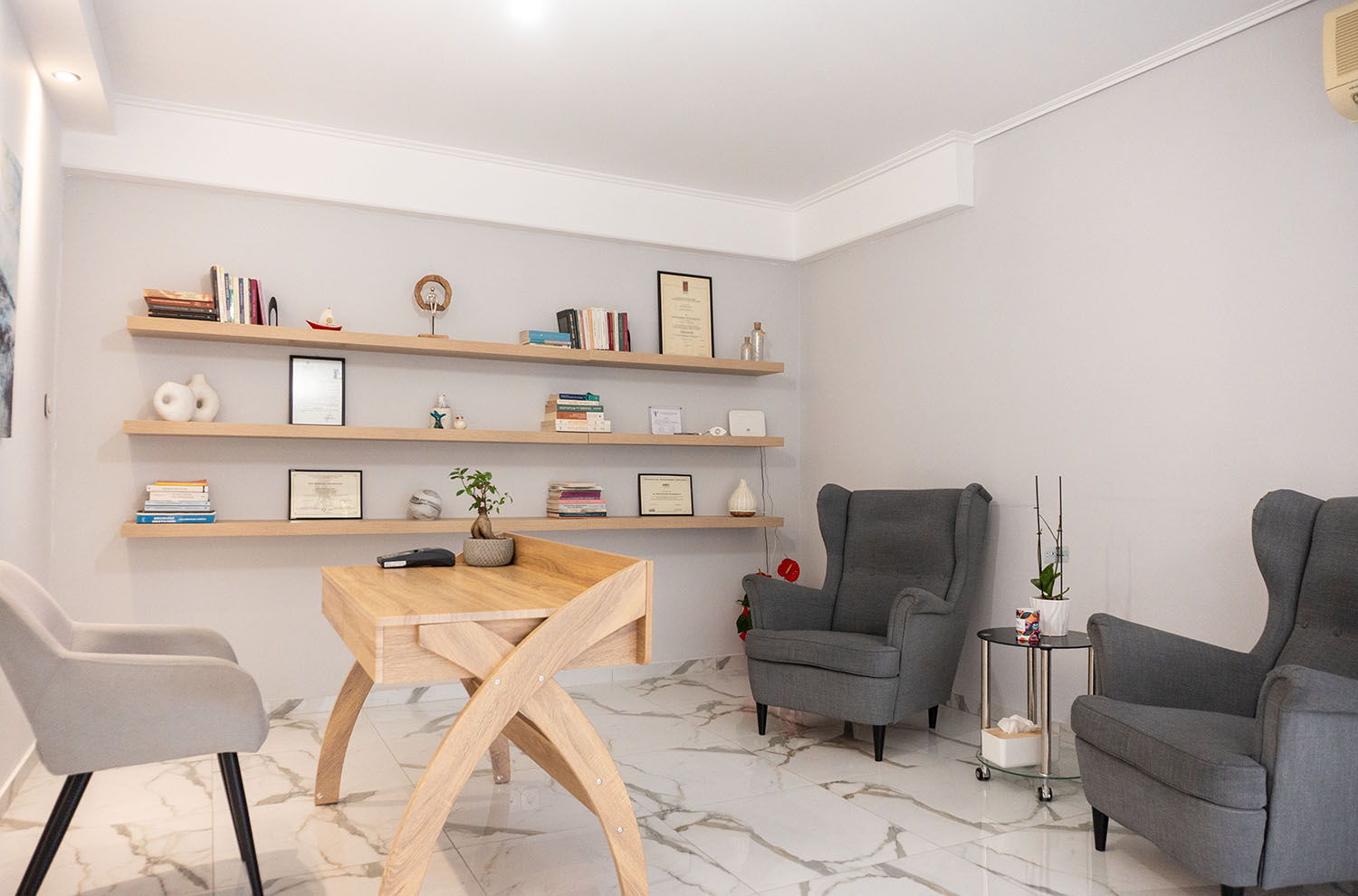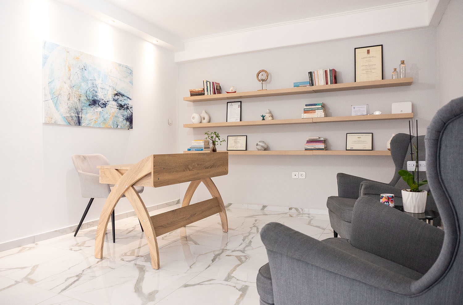 Στο γραφείο μου, στην Αγία Παρασκευή, έχω δημιουργήσει ένα περιβάλλον που στηρίζει την ηρεμία, την εμπιστοσύνη και τον σεβασμό. Είναι ένας χώρος όπου κάθε άνθρωπος μπορεί να νιώσει ασφαλής να μιλήσει, να εκφράσει σκέψεις και συναισθήματα χωρίς φόβο ή κριτική, και να συνδεθεί βαθύτερα με τον εαυτό του.